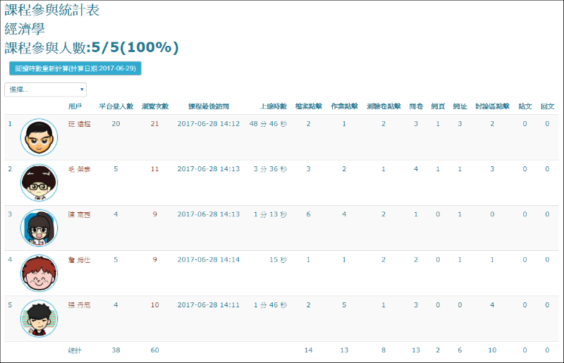 學生課程參與統計表 標籤 (Tags) Moodle 報表 學生課程參與統計表可統計學生的瀏覽次數、作業點擊、問卷點擊…等數量。 準備時間 1分 難度 易 操作指引 學生課程參與統計表呈現學生在課程內的參與、互動情形。統計學生的瀏覽次數、作業點擊、問卷點擊…數量。