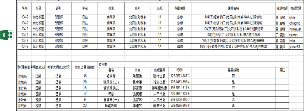 課程資訊統計表 標籤 (Tags) Moodle 報表 課程資訊統計表記錄了學院、系所、課程名稱、授課教師...等課程相關資訊。 準備時間 1分 難度 易 操作指引 課程資訊統計表依照學年期、學院,搜尋課程相關資訊。支援Excel檔案下載。
