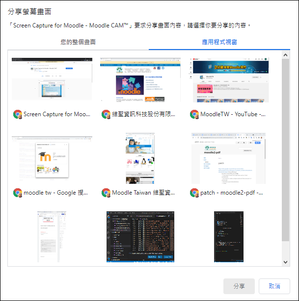 使用 Chrome 瀏覽器 + MoodleCAM 就是你的隨身錄影小幫手;多種錄影模式可選:可錄電腦桌面、特定視窗、麥克風收音、WebCAM(主講者)鏡頭... 可自由搭配。