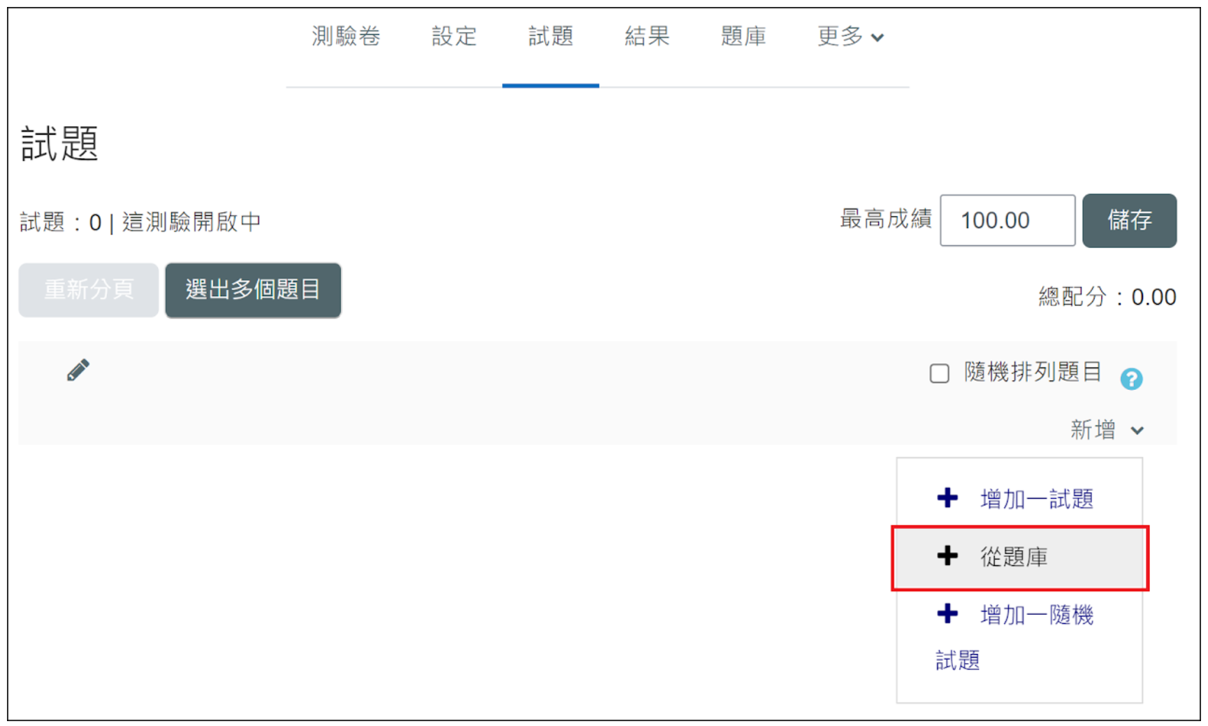 在右下方「新增」下拉式選單中點選「從題庫」,將顯示題庫中所有的試題。