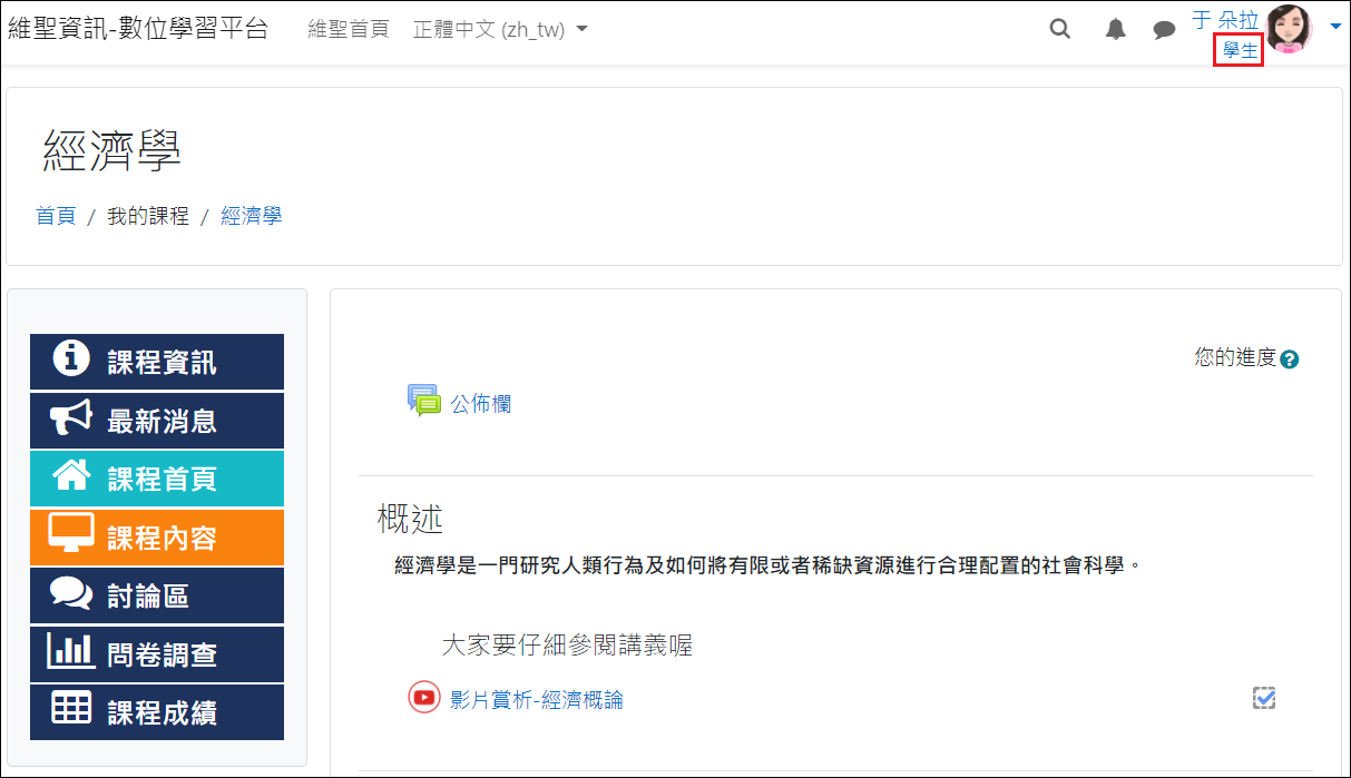 Q:如何模擬學生角色? 標籤 (Tags) Moodle 角色 基本操作 FAQ 教師在佈建課程教材時,可使用「變換角色」的功能,如此一來,就可以得知學生在使用課程教材時的瀏覽畫面。 準備時間 5分 難度 易 操作指引 Q:如何模擬學生角色?A:1. 首先,進入課程。2. 點選右上角用戶選單中的「變換角色為…」 3. 選擇要變換的角色。 教師的課程畫面 模擬學生的課程畫面 注意:此「變換角色」功能為模擬身份,並不會改變您原來的角色,因此即使變換學生角色與真實學生仍有些許功能不同。 本功能之相關操作影片