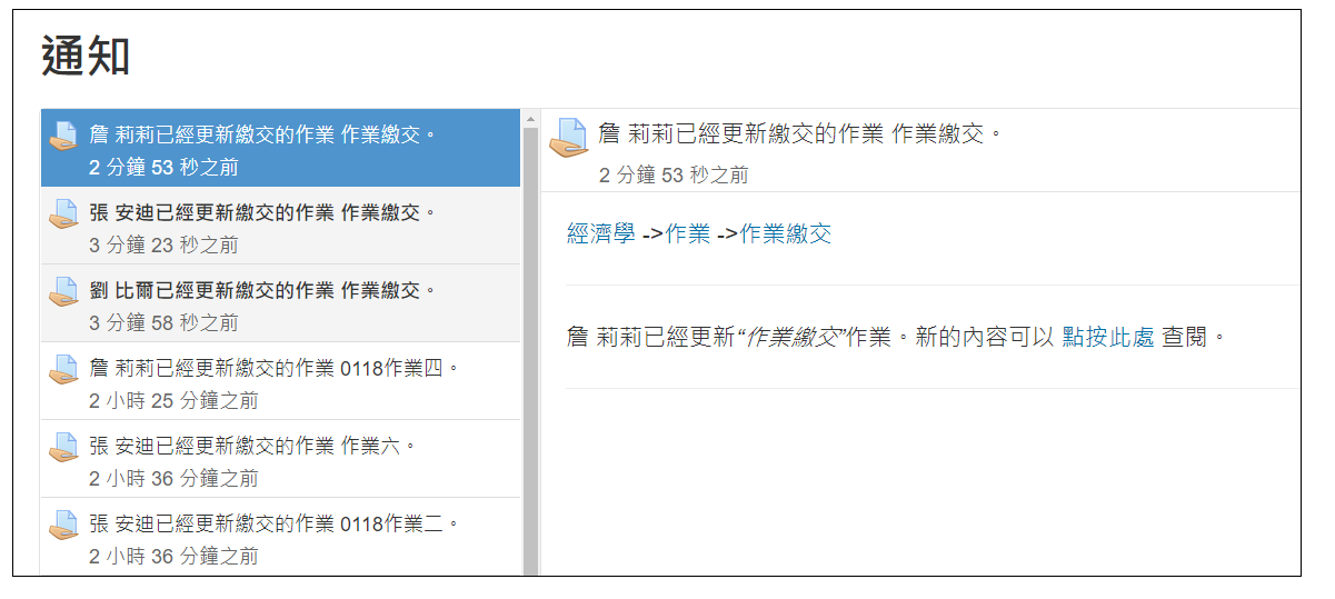- 訊息列表將列出學生繳交作業的通知,老師開啟訊息內容即可進入作業評分的頁面,並可得知該項作業尚有幾位學生需要評分,進而一併評分。