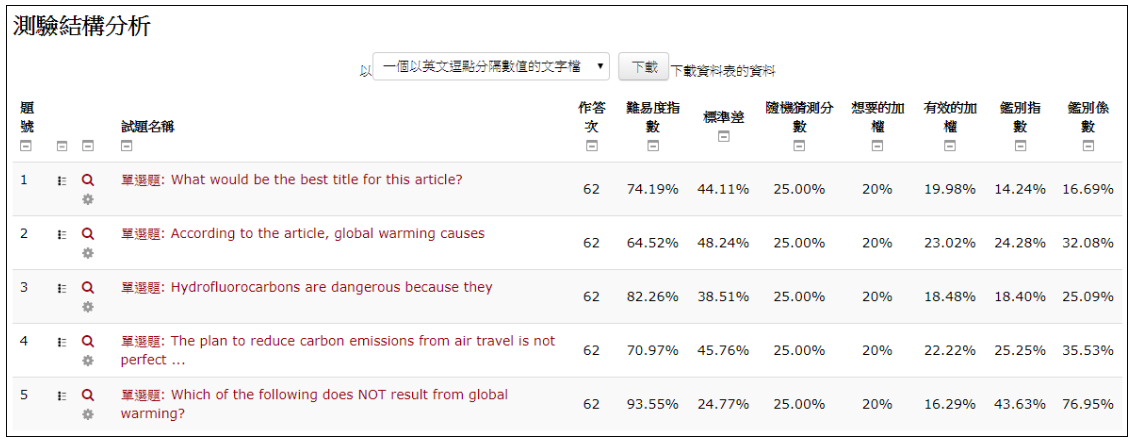 A:測驗結構分析顯示學生答題狀況的統計數據,部分數據分析了試題的屬性,如答對率、標準差等,提供老師命題、檢討試題的方向。