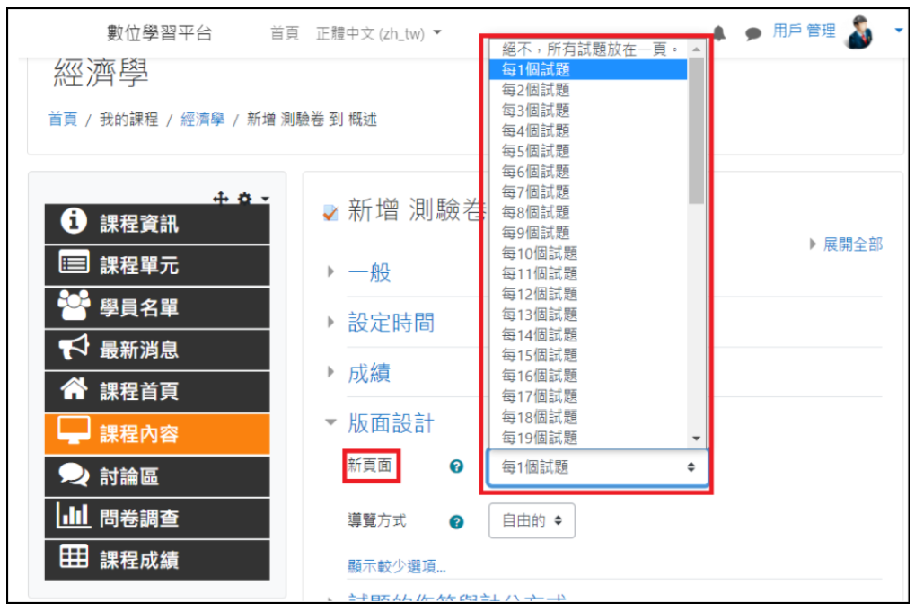 Q:如何設定測驗卷版面? 頁面顯示題數、導覽方式(順序的/自由的)