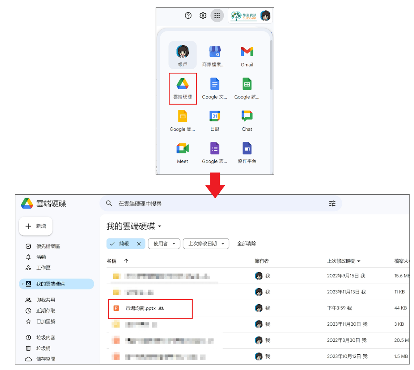 - 老師先進入Google我的雲端硬碟裡,並將檔案教材上傳至Google雲端硬碟中。