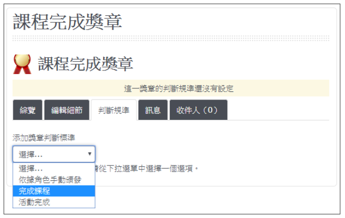 取得獎章的判斷標準分別有「依據角色手動頒發」、「完成課程」、「活動完成」,以下將分別介紹。