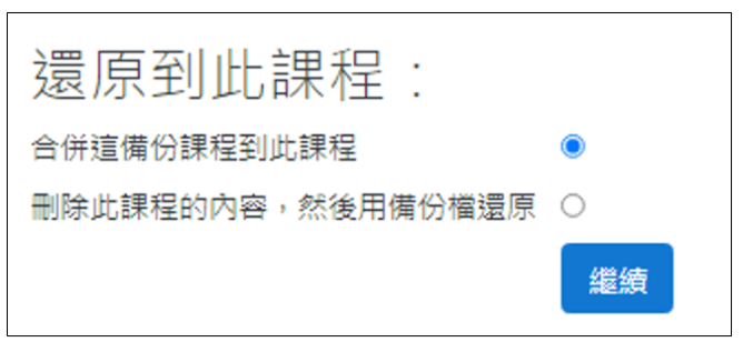 - 會將該舊課程備份檔中的活動與資源合併至您目前的課程中。