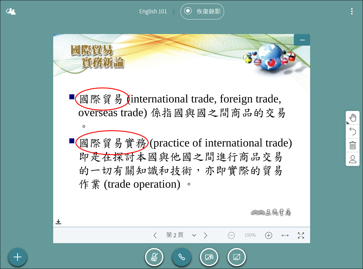 藉由螢幕分享畫面來補充一些需要示範性的教學或是其他想要分享的教材、網頁,可增加教師在操作上的方便性,也增強教師與學生間的影音互動。